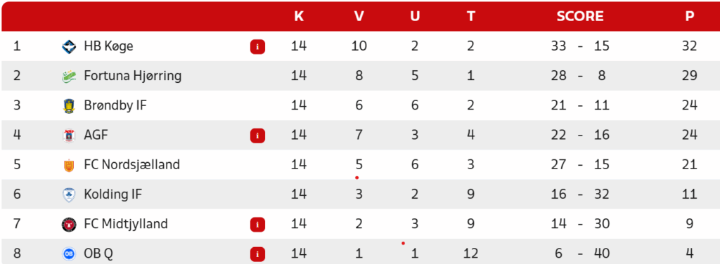 Stillingen i A-Ligaen efter Grundspillets sidste kamp: