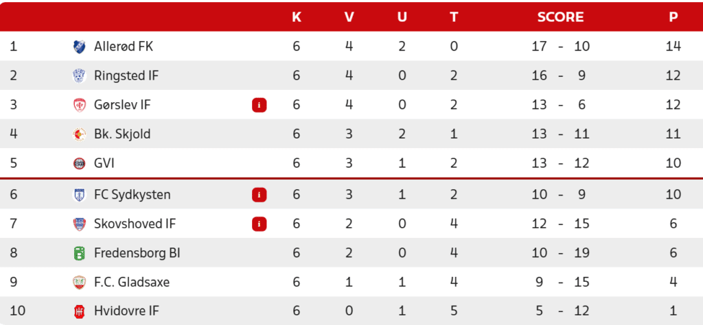 Stillingen i Danmarksserien Pulje 1 efter lørdagens kampe: