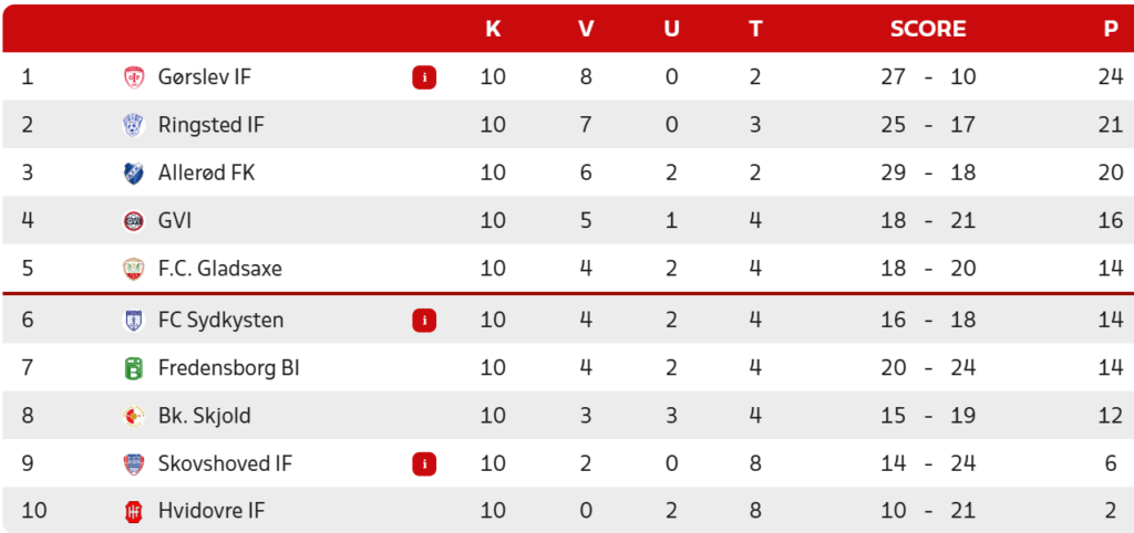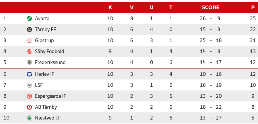 Stillingen i Danmarksseriens Pulje 1 efter lørdagens kampe: