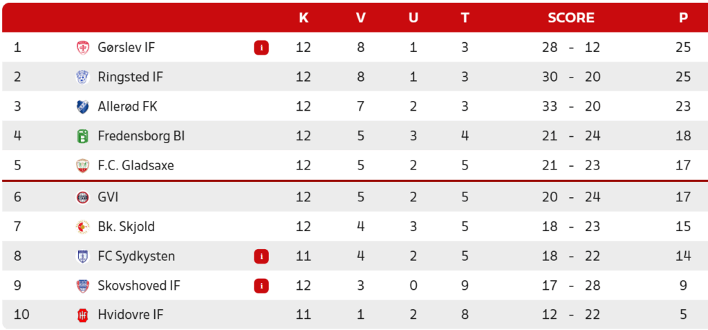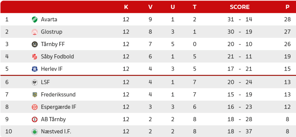 Stillingen i Danmarksseriens Pulje 1 efter lørdagens kampe: