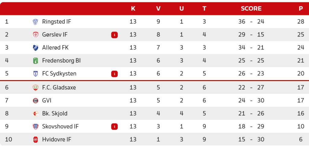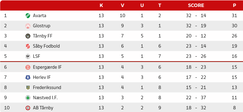 Stillingen i Danmarksseriens Pulje 1 efter lørdagens kampe: