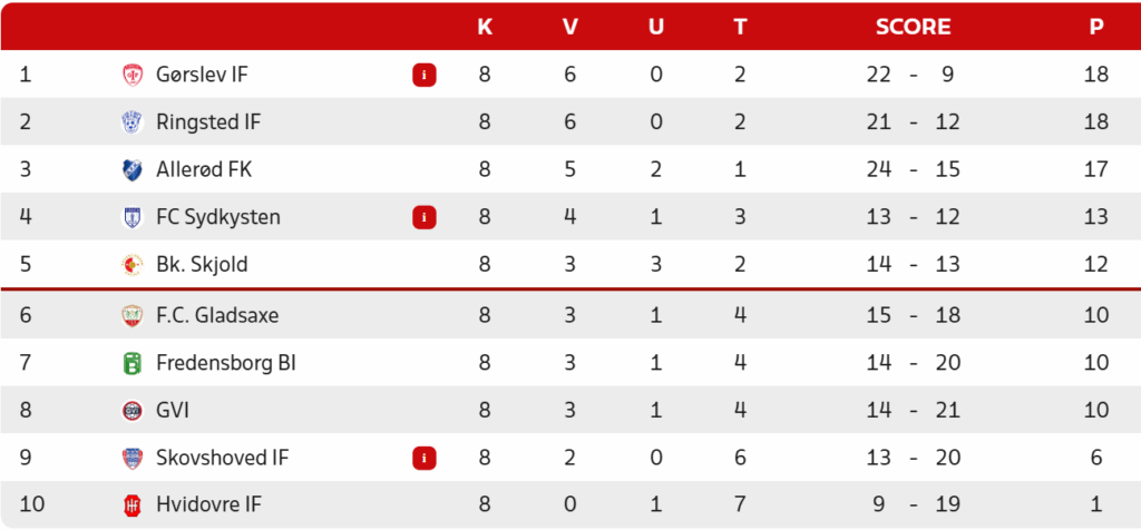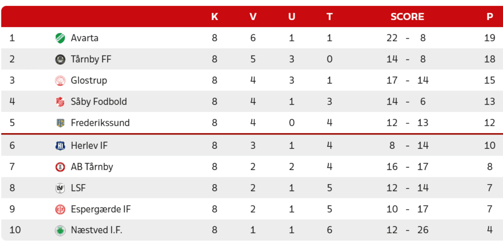 Stillingen i Danmarksseriens Pulje 1 efter lørdagens kampe: